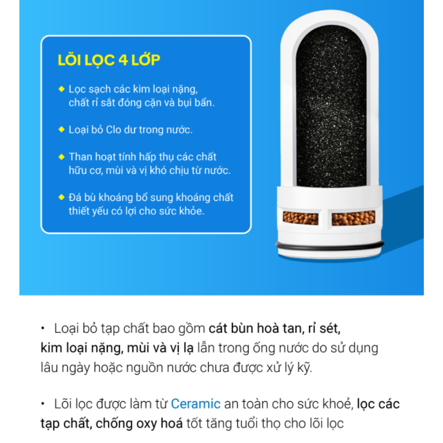 Sạch từng giọt nước: Với 04 lớp lọc cao cấp, loại bỏ vi khuẩn, tạp chất, mang lại nguồn nước sạch và an toàn.