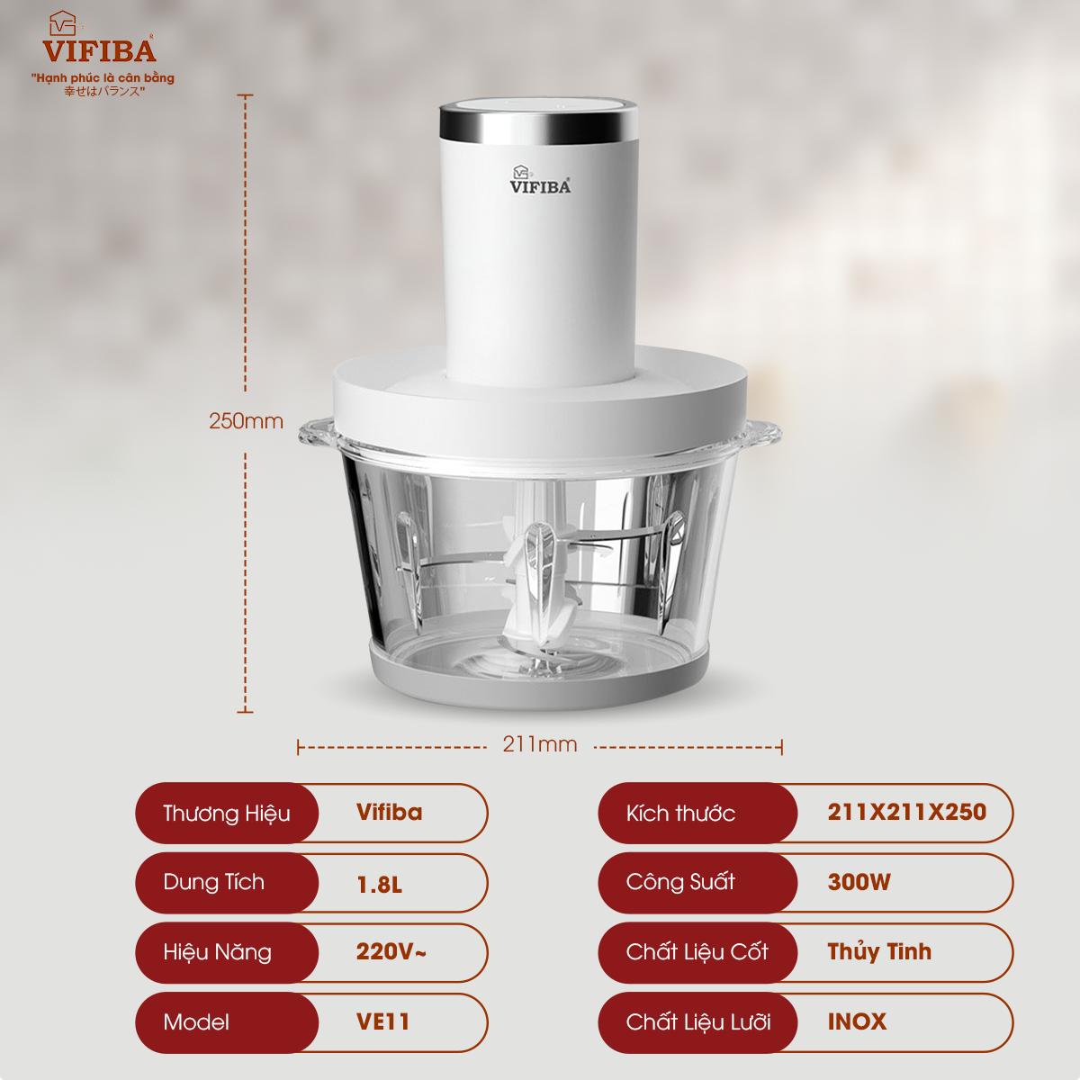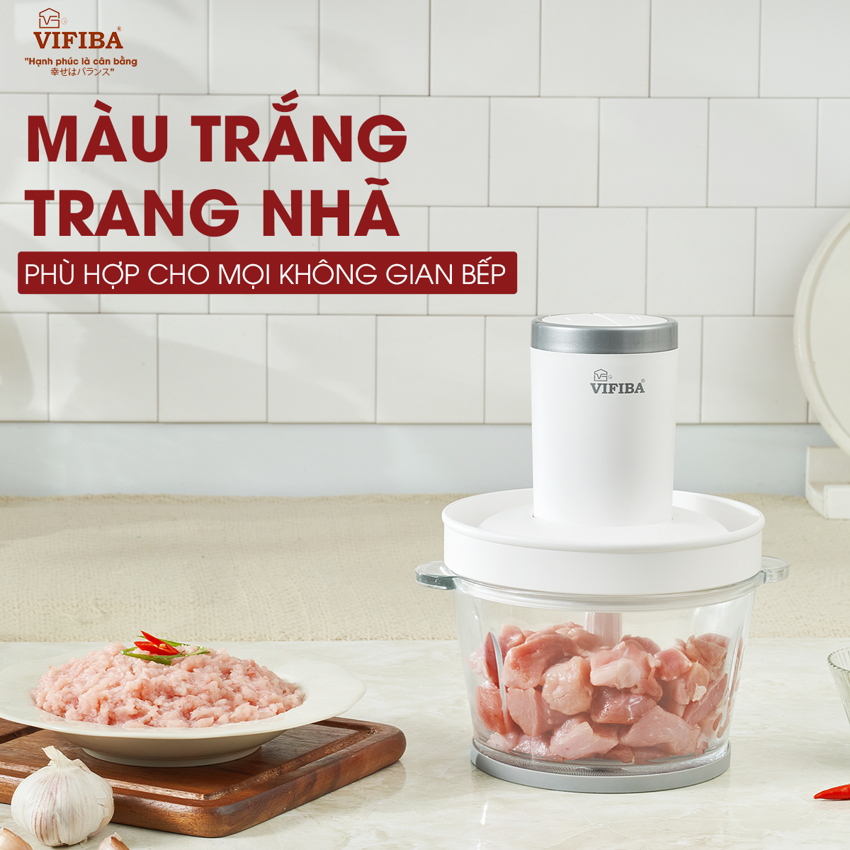 - Máy xay thịt vifiba Thiết kế trắng sang trọng cùng cối xay được làm từ chất liệu thủy tinh cao cấp.