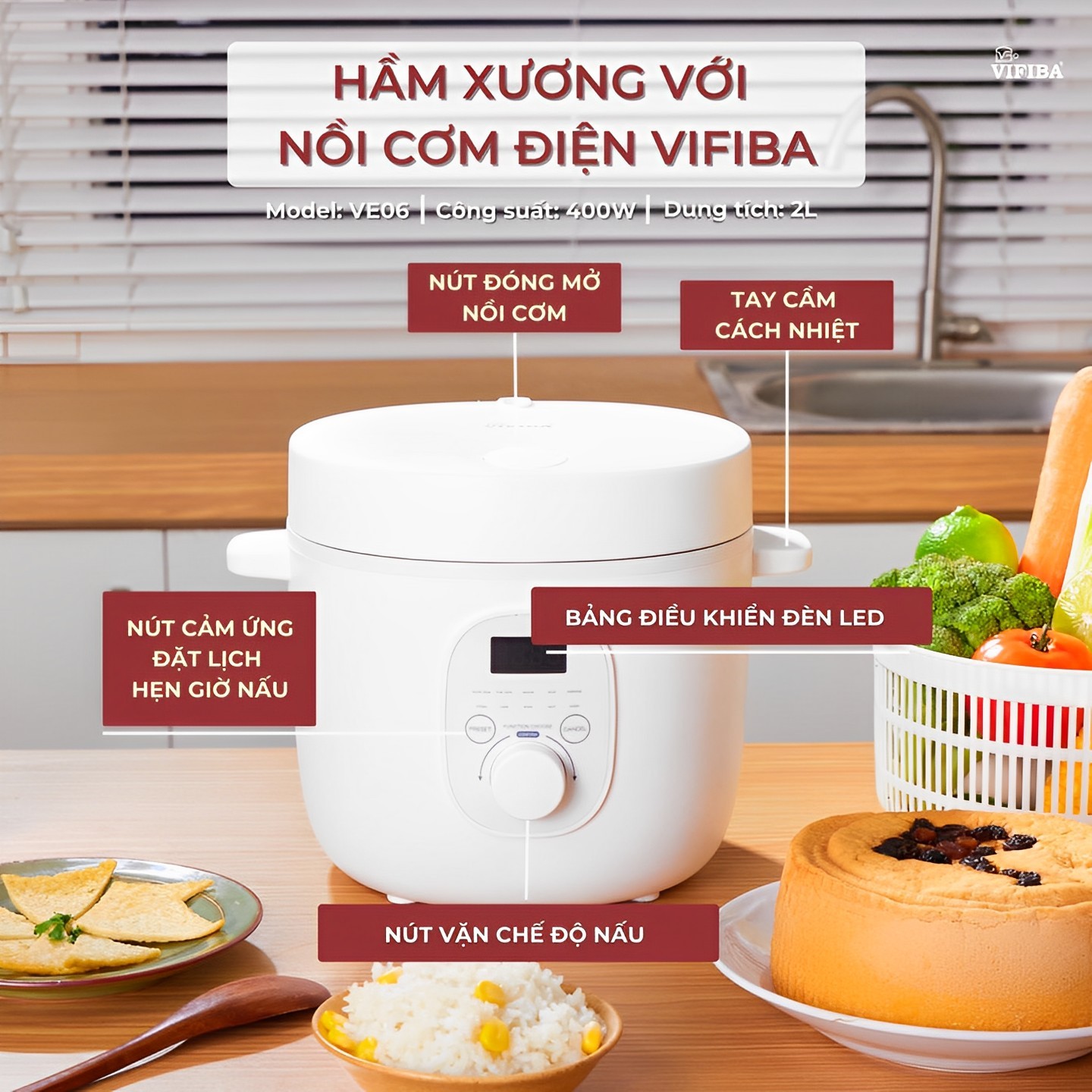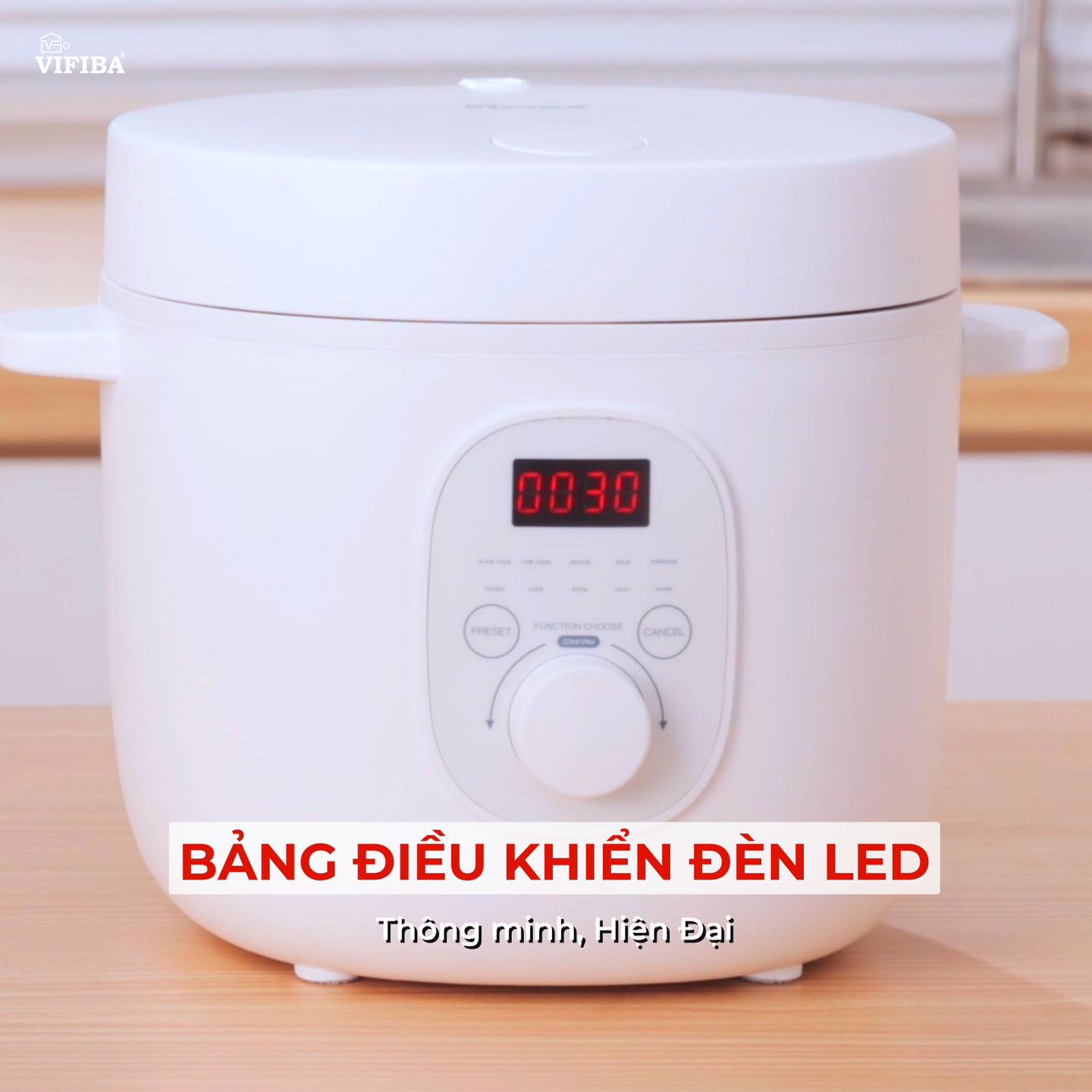 - Nồi cơm điện tử VIFIBA tích hợp 10 chức năng nấu gồm nấu nhanh, nấu chậm, cháo, hầm, súp, làm bánh, sữa chua, gạo nếp, hâm nóng, giữ ấm và cài đặt thời gian nấu