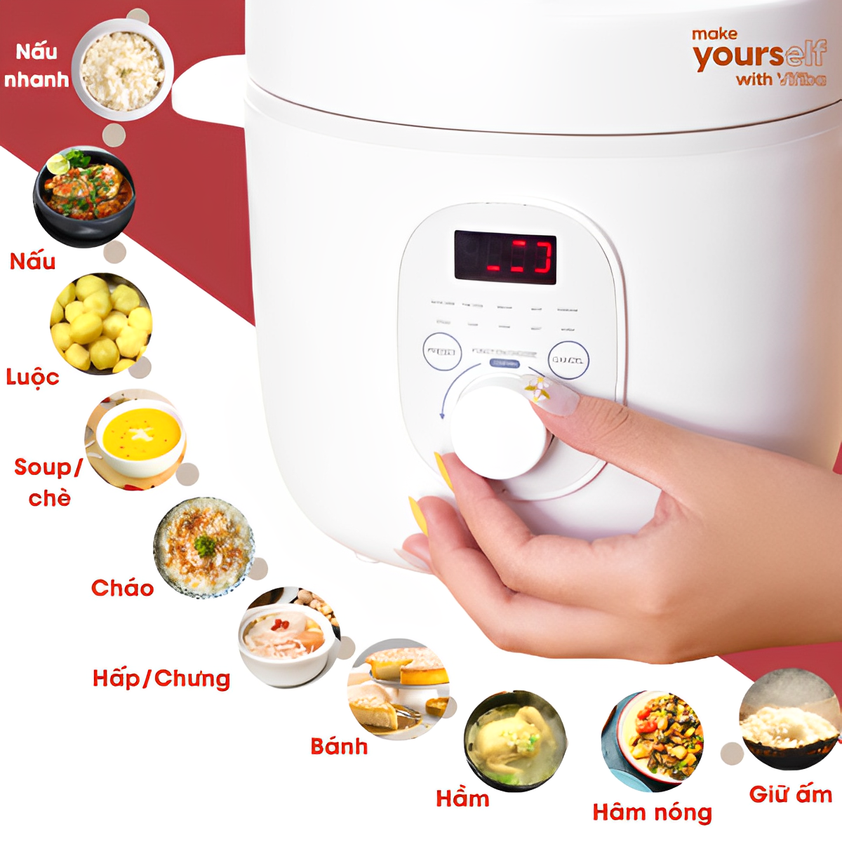 - Xoay nút điều khiển -> Chọn chế độ nấu -> Sau 5 giây Nồi cơm điện đa năng Vifiba sẽ tự động kích hoạt nấu (Màn hình đèn LED các gạch ngang chạy vòng chữ nhật)-> Hạn chế tối đa việc quên bấm nút nồi cơm.