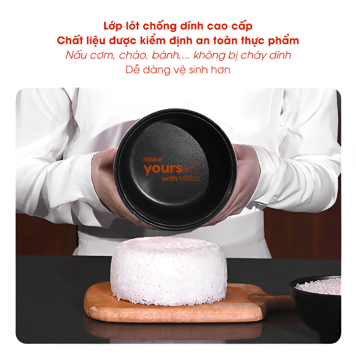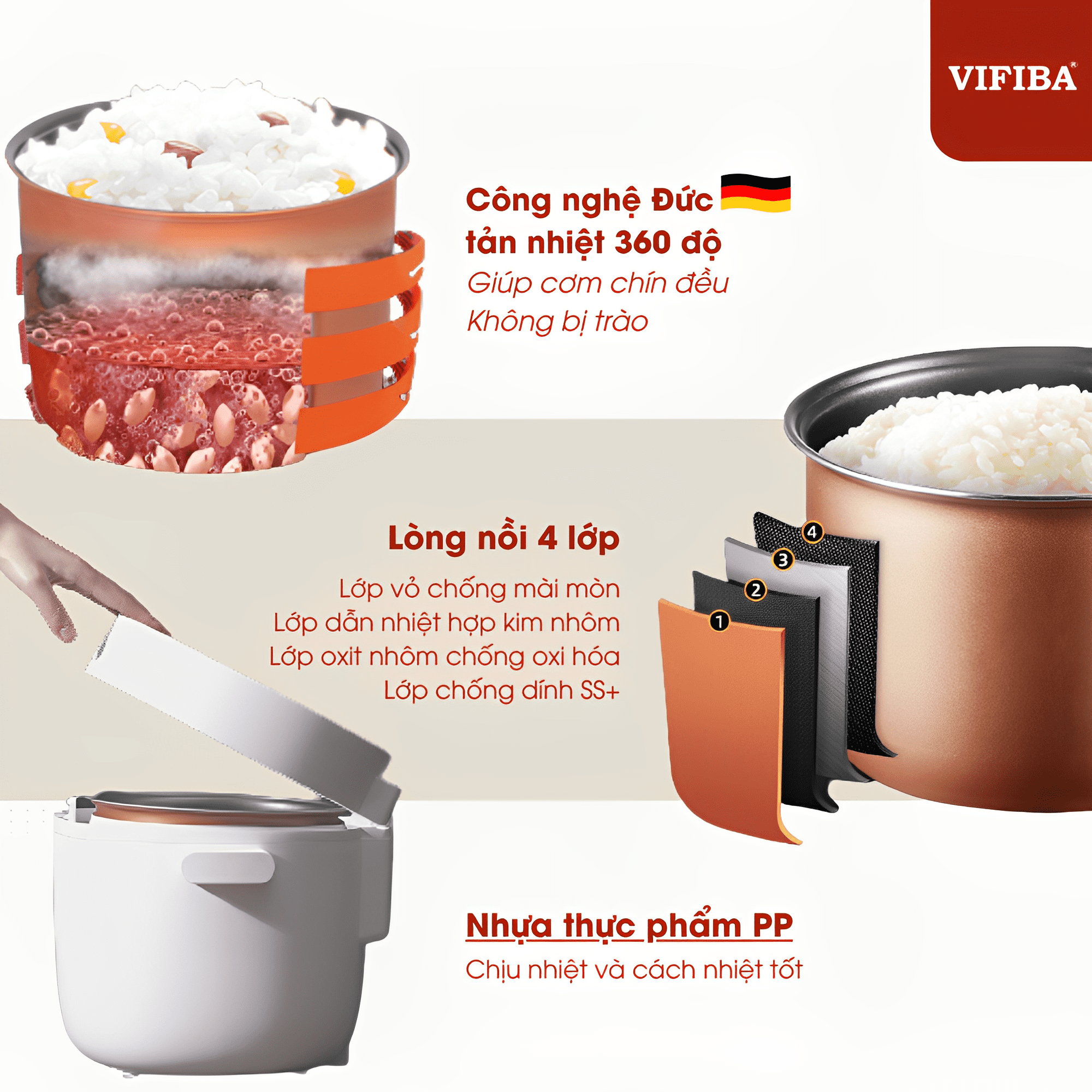 - Lòng nồi cơm điện đa năng Vifiba bằng chất liệu hợp kim nhôm cao cấp đến 4 lớp: Lớp vỏ chống mài mòn, lớp dẫn nhiệt hợp kim nhôm, oxit nhôm chống oxi hoá, chống dính SS+