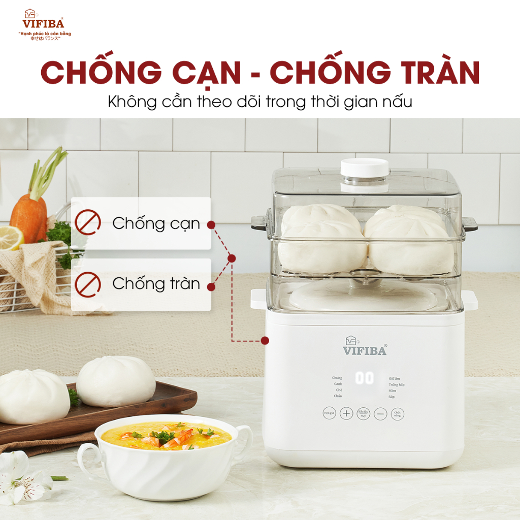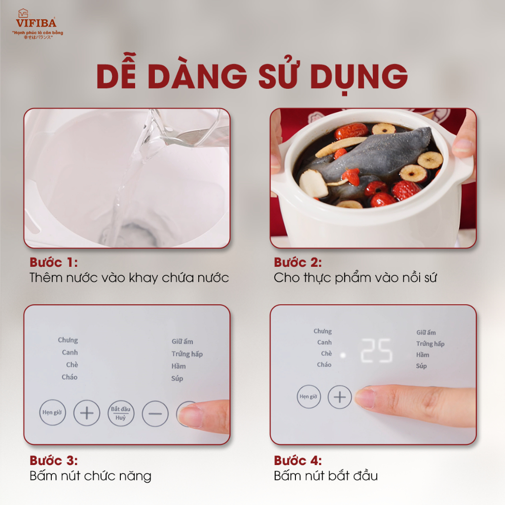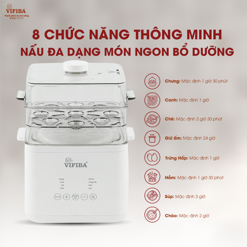 - Chức năng đa dạng: Nồi có 8 chương trình chức năng nấu nước chuyên biệt cho các món ăn khác nhau như chưng, canh, chè, cháo, hầm, và nhiều hơn nữa.